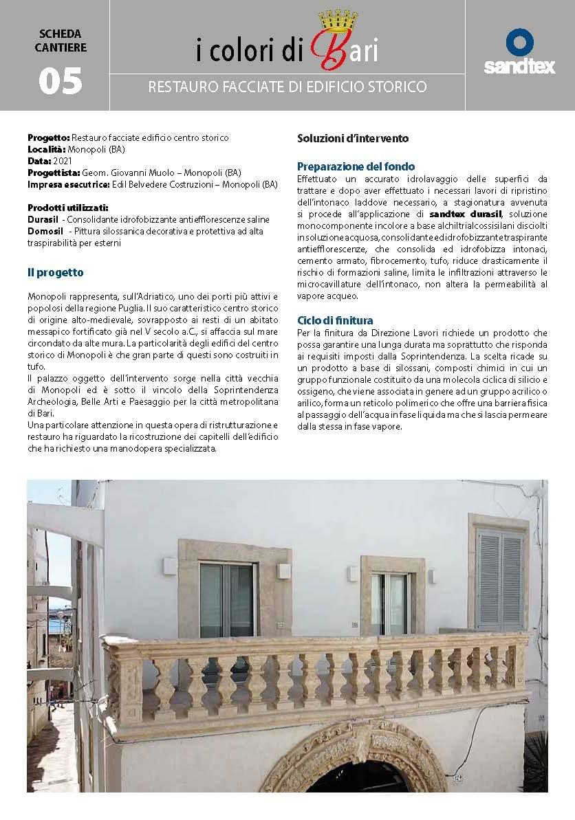 In questo intervento di restauro di un palazzo ubicato nel centro storico di Monopoli, c’era bisogno di una finitura in facciata che sia autopulente, traspirante e in grado, allo stesso tempo, di non assorbire acqua.